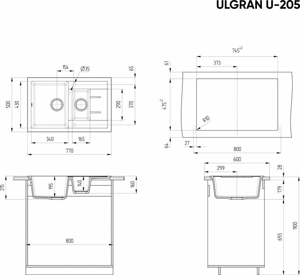 Мойка для кухни Ulgran U-205 (-341, ультра-белый)