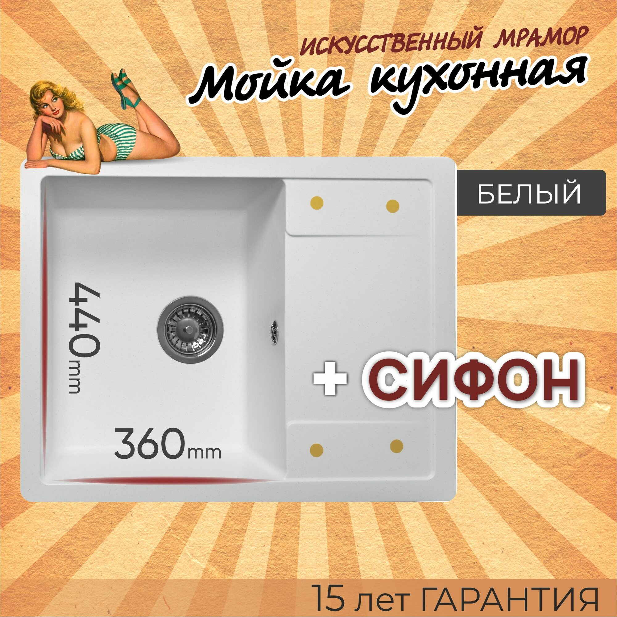 Мойка для кухни врезная каменная Dr. Gans ТЕХНО-650, цвет белый, с крылом, прямоугольная, 650х510х217 мм
