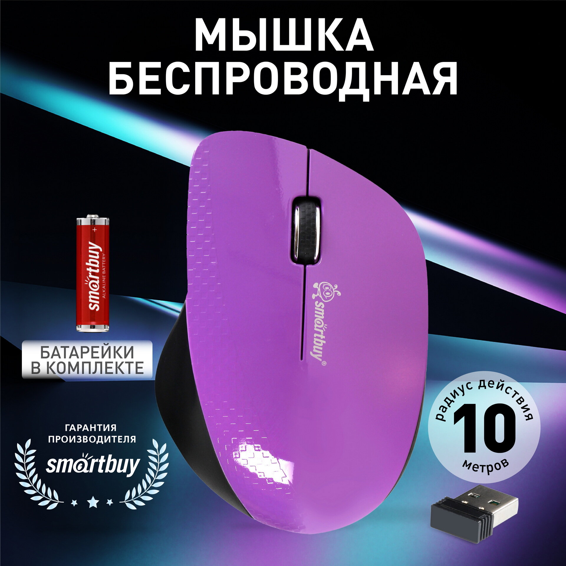 Мышь беспроводная Smartbuy 309AG USB/DPI 1000/3 кнопки/1AA фиолет/черный (SBM-309AG-P)