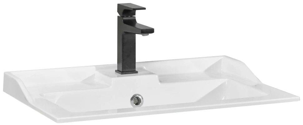 Смеситель установлен на мини пьедестале. Глубина вполне хорошая, вода во всяком случае не разбрызгивается по сторонам, что облегчает уборку в ванной комнате. На тумбу раковина легла вплотную, без щелей, толи это тумба с раковиной, толи отдельно - не поймешь |