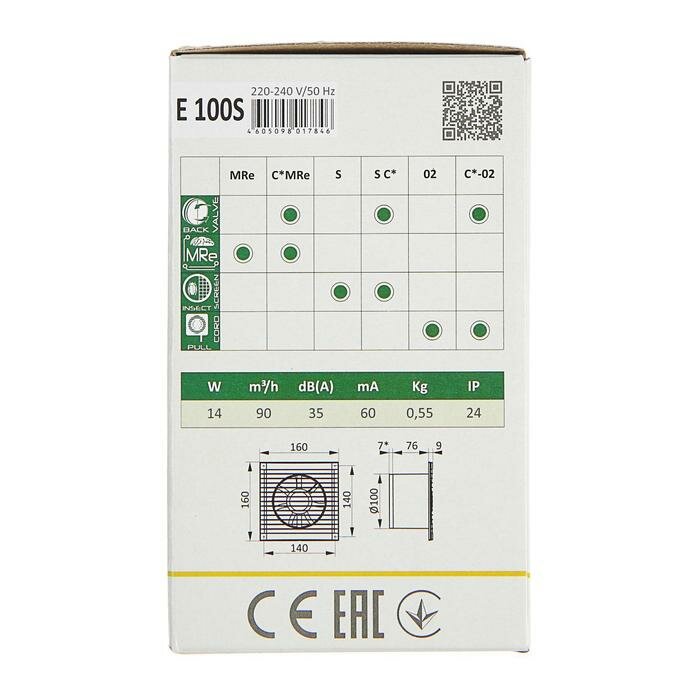 Вентилятор осевой вытяжной Era E 100 S, c антимоскитной сеткой, D 100, 14 Вт