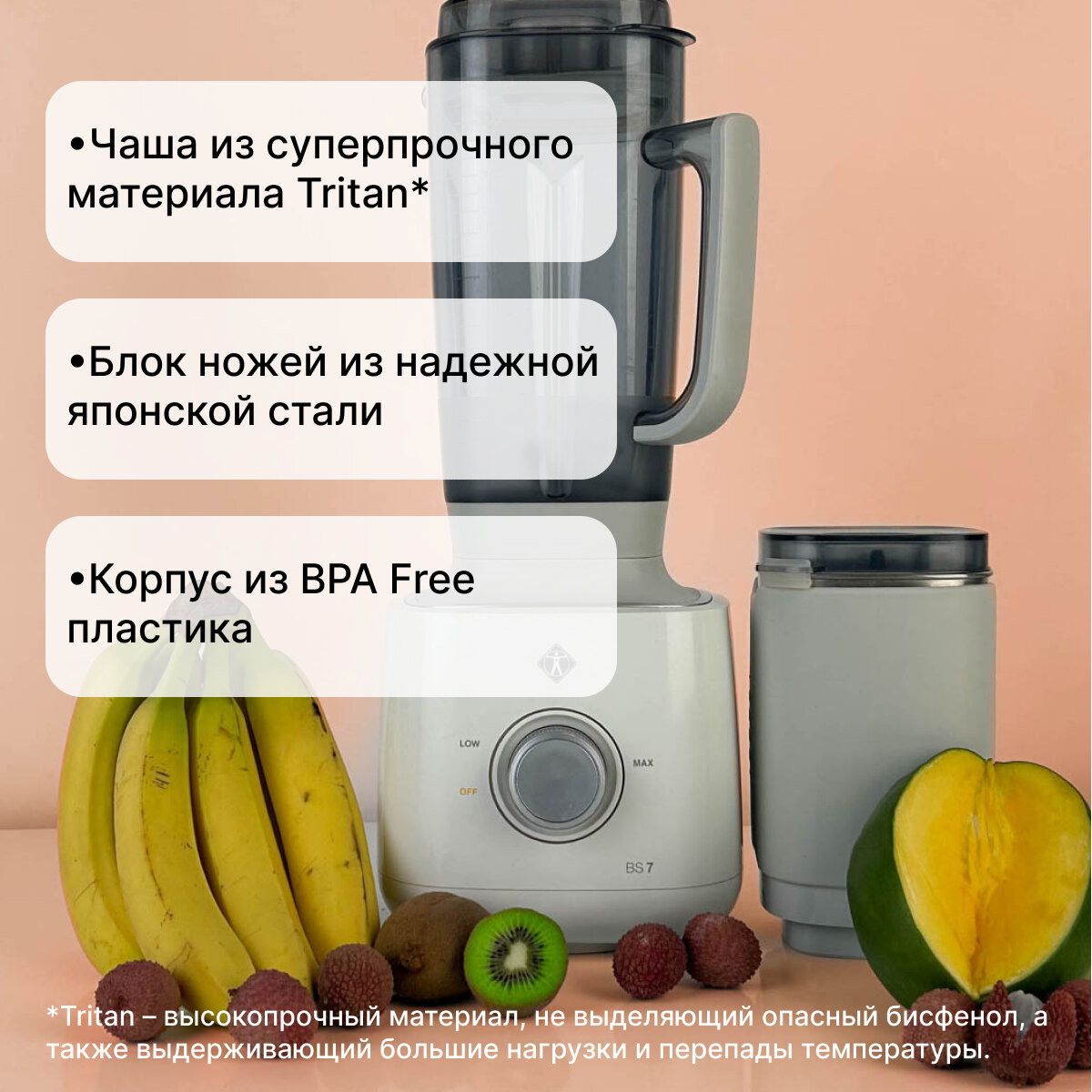 Выбирали между ТрайБест и Лекуип. Эта модель в итоге покорила, действительно самый мощный блендер из существующих. Так зачем покупать что-то менее крутое и надёжное, подумали мы)) По итогу: супер-машина, работает бесперебойно, всё идеально измельчает и смешивает без комков и кусков. Очень удобная чаша, всё продумано, не тяжёлая. Преобразила нам весь процесс готовки на кухне. Для примера: кидаем в чашу помидоры, болгарский перец, огурец, немного специй, капля масла, и чеснок. Ничего не надо резать, не надо пачкать другую посуду. (Только достать семена из перцев). Повернул реле и ушёл по своим делам. Пришел через 3 минуты – а тебя уже ждёт отличный суп гаспаччо, лучше чем ресторанный. Снимаем чашу, наливаем прямо из неё в миску, кидаем сушёный лук или гренки… вуаля, вы восхитительны)) Пюре, паштеты из семечек, даже паштет из свинины, супчики, арахисовая паста, творог с зеленью для соуса – вариантов что готовить уйма. Ну и конечно овощные и фруктовые коктейли. Огромную гору фруктов можно перемолоть и выпить как смузи за какие-то полминуты. Мгновенное чувство насыщение, заполнение желудка. И не надо заставлять себя жевать всё это. Плюс в комплекте идет чаша-измельчитель. Идеальна для специй |