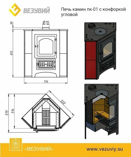 Печь-Камин везувий ПК-01 (220) угловой красн. 9 кВт (150 м3) Ø 115мм