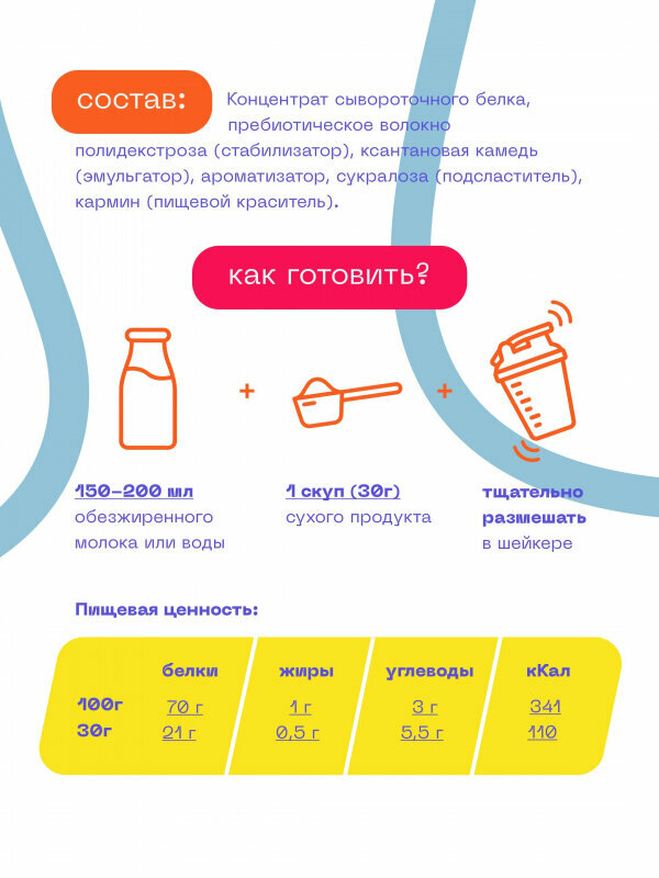 | Минусы: | Плоховато растворяется (в шейкере), но если поднапрячься, остаётся не очень много комков. Мне показался не очень сытным/густым (сравниваю со своими предыдущими покупками). |