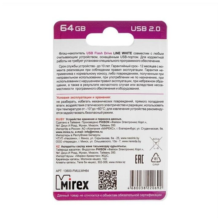 Mirex Line White <13600-fmulwh64> USB2.0 Flash Drive 64Gb rtl