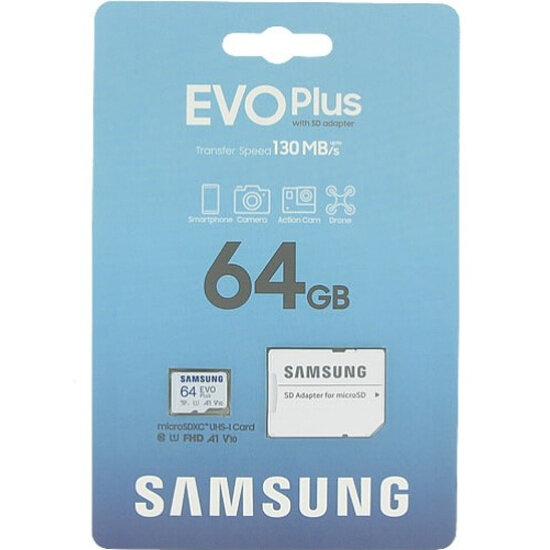 Карта памяти Samsung EVO Plus microSDXC 64 ГБ Class 10, V10, A1, UHS-I U1, R 130 МБ/с, адаптер на SD