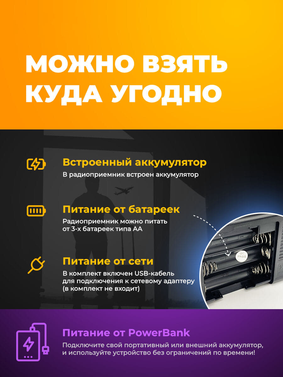 | Плюсы: | Хорошо ловит радиостанции, есть короткие волны, можно прослушивать музыку с карты памяти или флешки, имеет собственный аккумулятор, заряд держит долго, хороший звук |