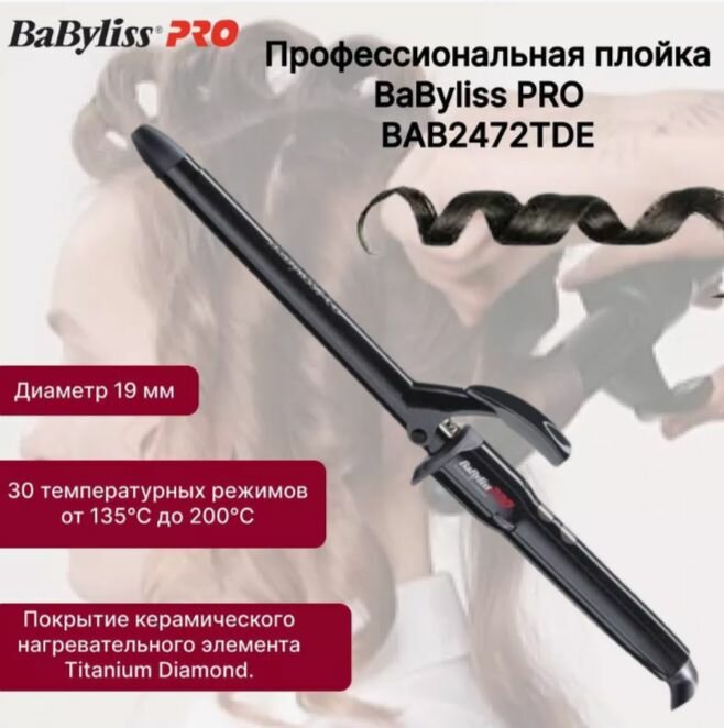 Плойка для волос BaByliss Pro BAB2472TDE Titanium Diamond терморегулятор, удлиненное полотно d 19 мм 2,7 м. 135-220 C