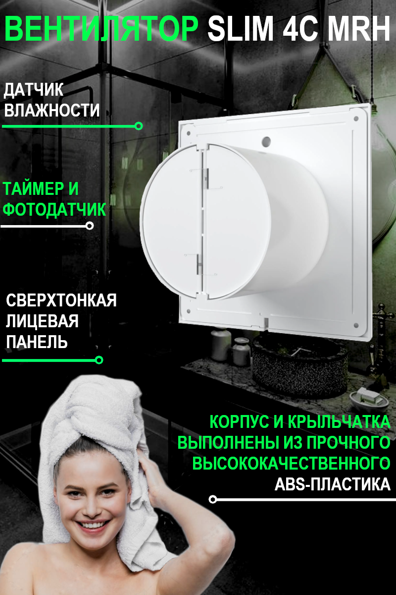 Вытяжной вентилятор 100 с обратным клапаном таймером с датчиком влажности и света SLIM 4C MRH