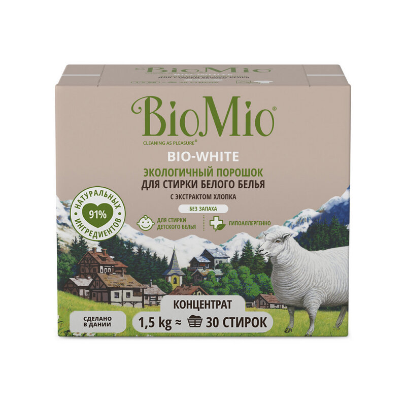 BioMio Bio-white Концентрированный гипоаллергенный экологичный стиральный порошок с экстрактом хлопока для белого белья без запаха 1,5 кг