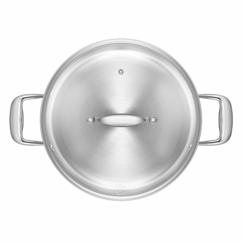 | Минусы: | Тонкие стенки, из-за тонкого металла при мытье создаётся ощущение, что можно порезаться об верхний край. Как мне кажется из-за тонких стенок не создаётся эффект запекания, как например в цептере. Отверстие для выхода пара постоянно забивается каплей пара, в принципе как и у многих стеклянных крышек, пока не дунешь в отверстие, пар выходит из под крышки и стекает по стенкам на плиту. Как сковорода не очень, всё-таки пригорает. |