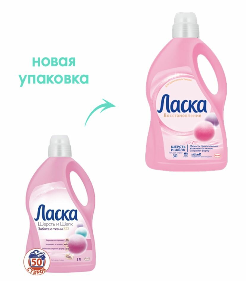 Гель для стирки Ласка Восстановление Шерсть и Шёлк для деликатных тканей, жидкое средство для стирки 3л (50 стирок)