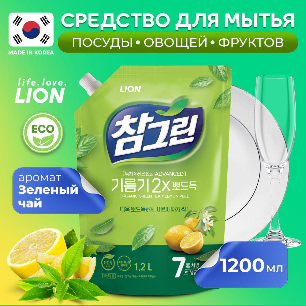 Средство для мытья посуды Lion Chamgreen Зеленый чай, мягкая упаковка с колпачком, 1.2 л