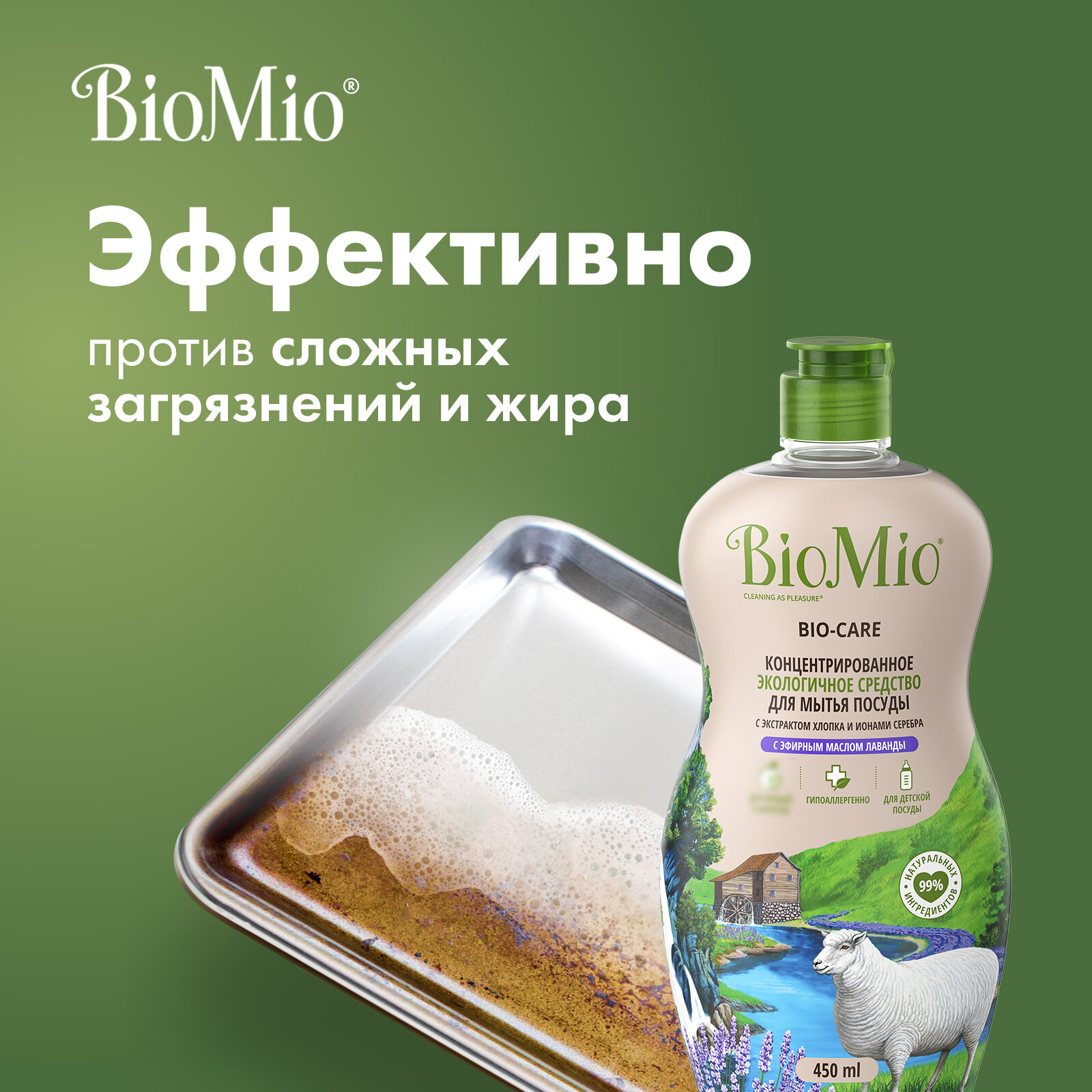 Средство для мытья посуды, овощей и фруктов BioMio Bio-Care с эфирным маслом лаванды, гипоаллергенное, экологичное, 450 мл