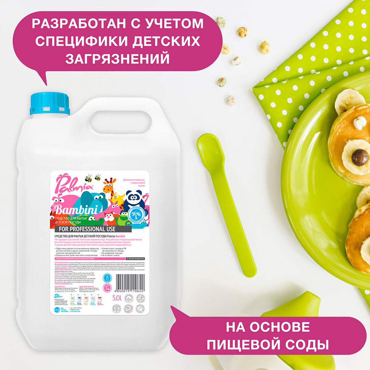 Гель для мытья детской посуды Palmia "Bambini" на основе пищевой соды, гипоаллергенный, 5 л
