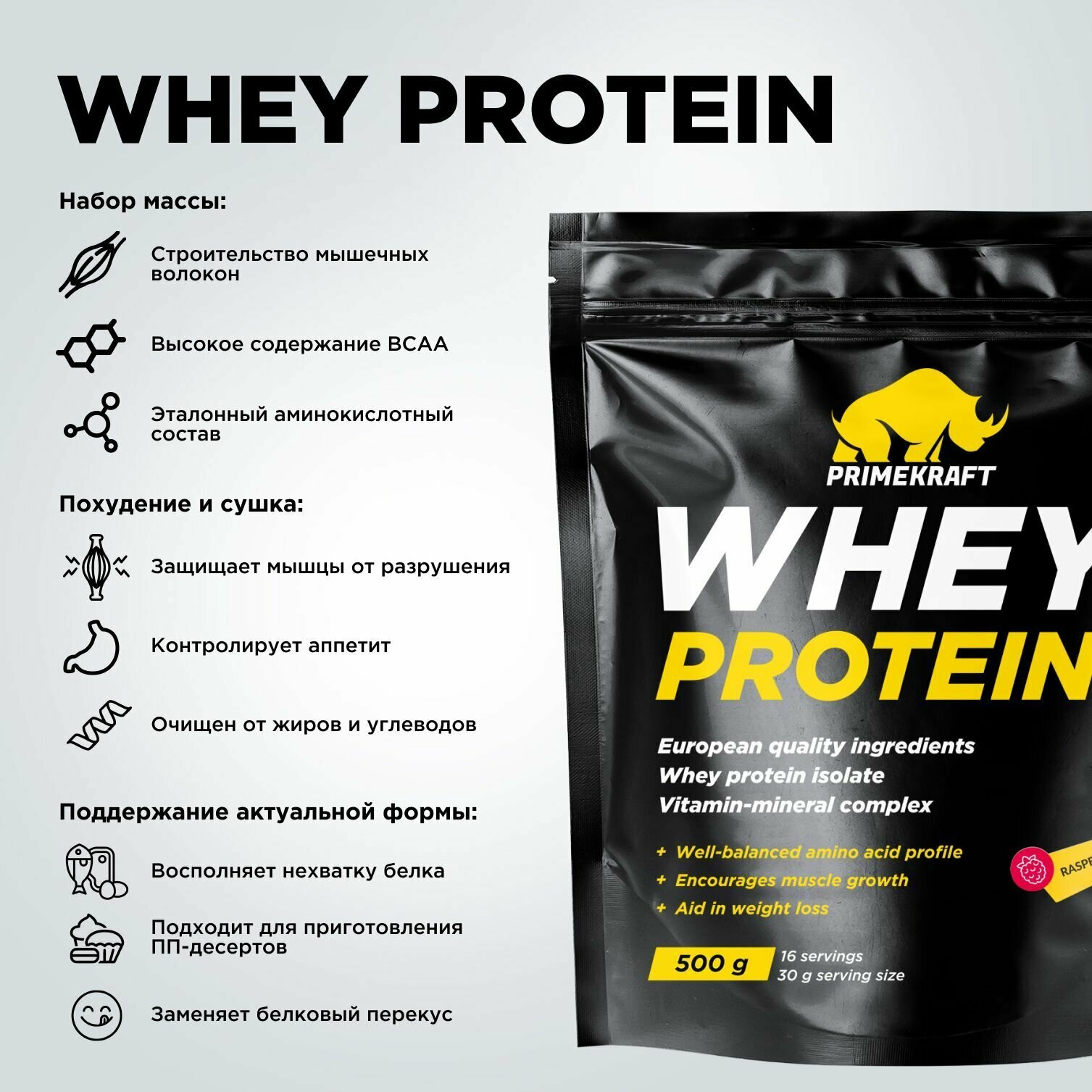 Сывороточный протеин Prime Kraft Whey Protein - 500 грамм (малина)