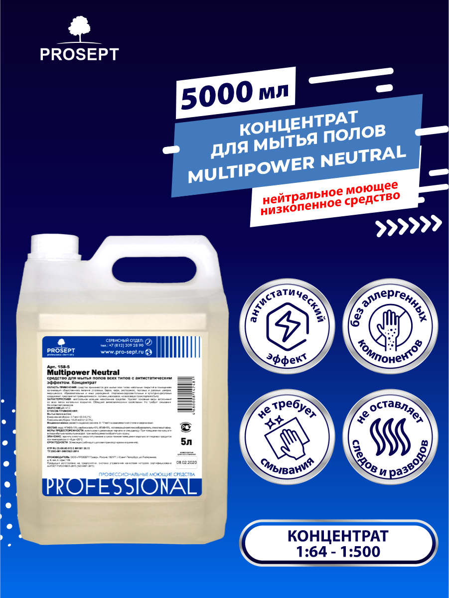 Средство для мытья полов PROSEPT Multipower Neutral с антистатическим эффектом концентрат 5 литров
