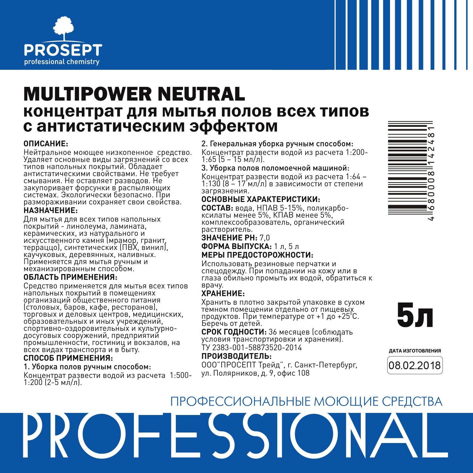 Купить Универсальное средство для мытья полов с антистатическим эффектом Prosept Multipower Neutral, 5 л