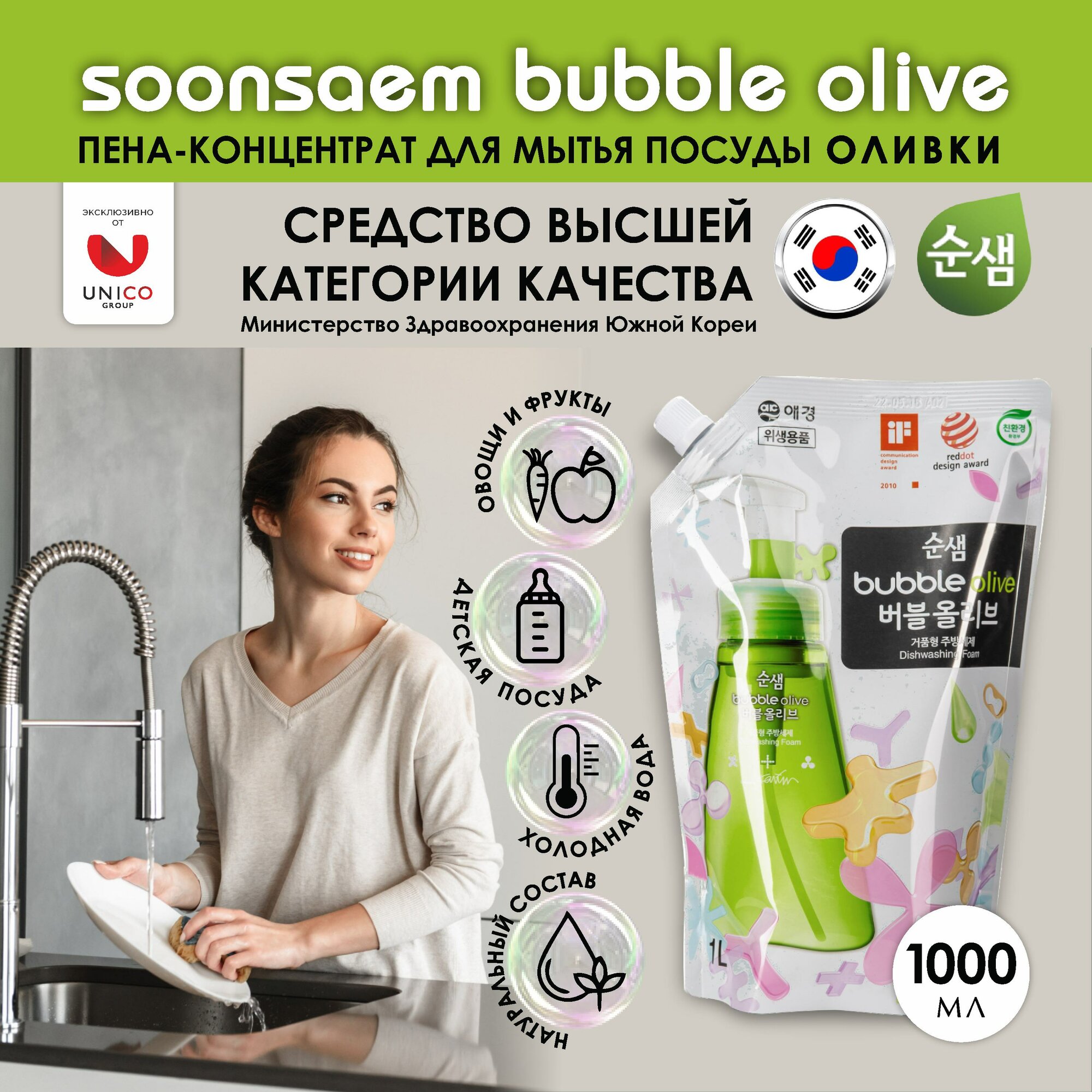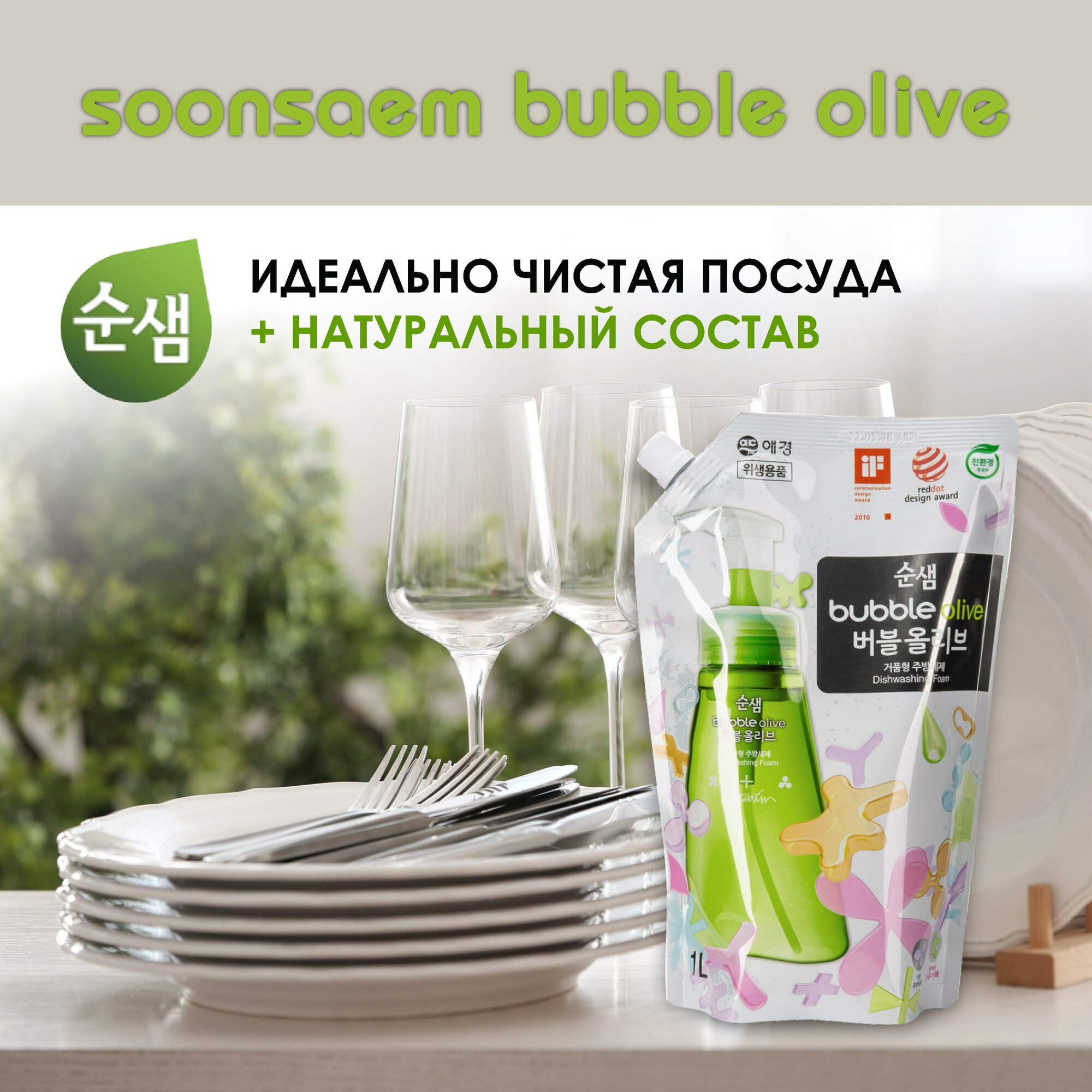 Aekyung Soonsaem Bubble Olive Пенка для мытья посуды Оливки 1000 мл в мягкой упаковке
