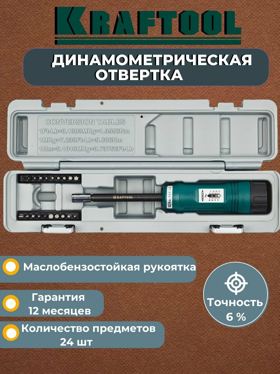 Отвертка динамометрическая KRAFTOOL со шкалой, регулируемая, 1-8 Нм, точность +/-6%, 20 бит, в боксе