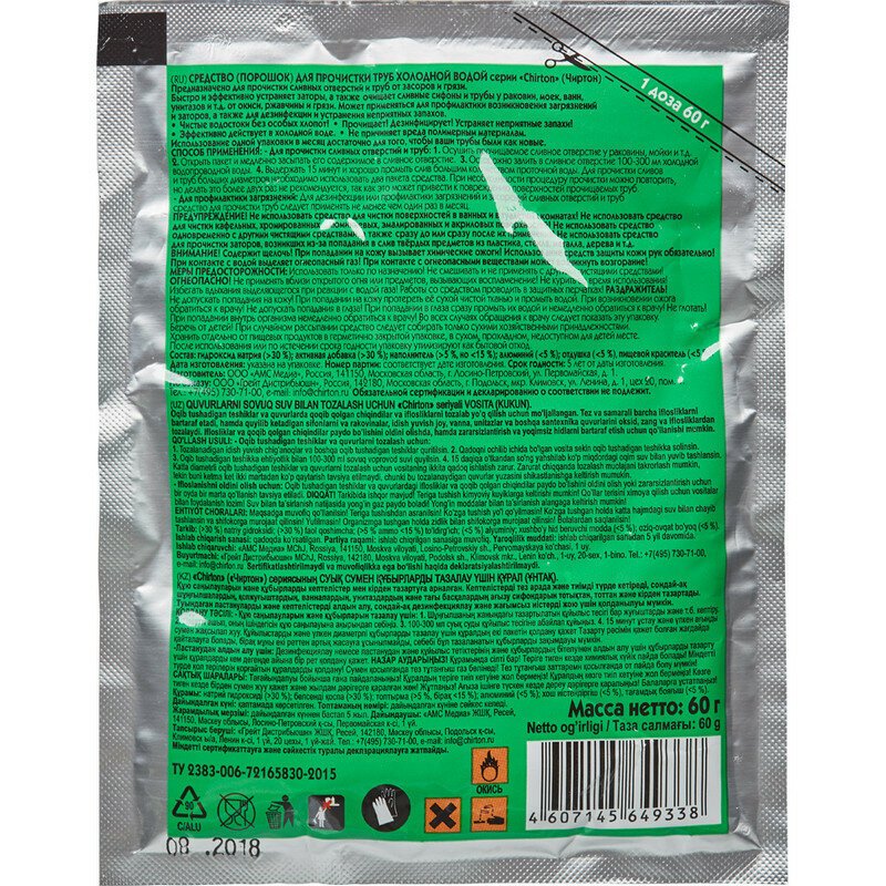 Чиртон / Chirton Гранулы для прочистки труб холодной водой пакетик 60 грамм