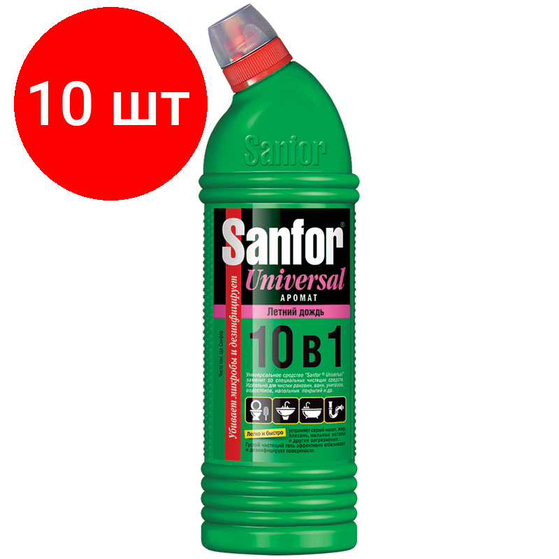 Купить Комплект 10 шт, Чистящее средство для сантехники Sanfor "Universal 10в1. Летний дождь", гель с хлором, 1л