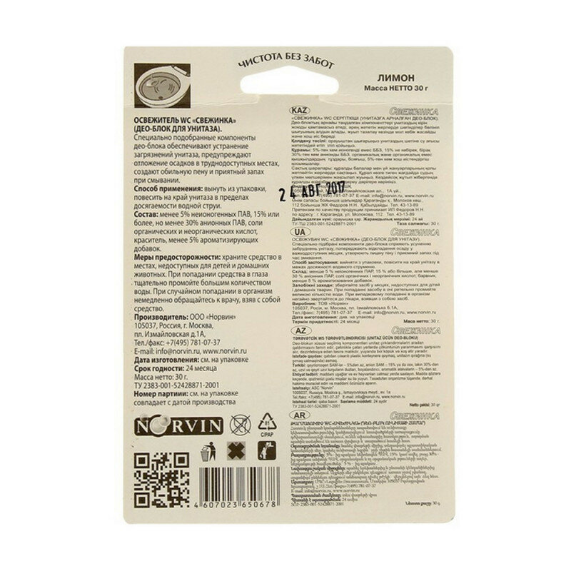 СохранитьОсвежающий блистер для унитаза Свежинка "Лимон", 30 гр интересное: