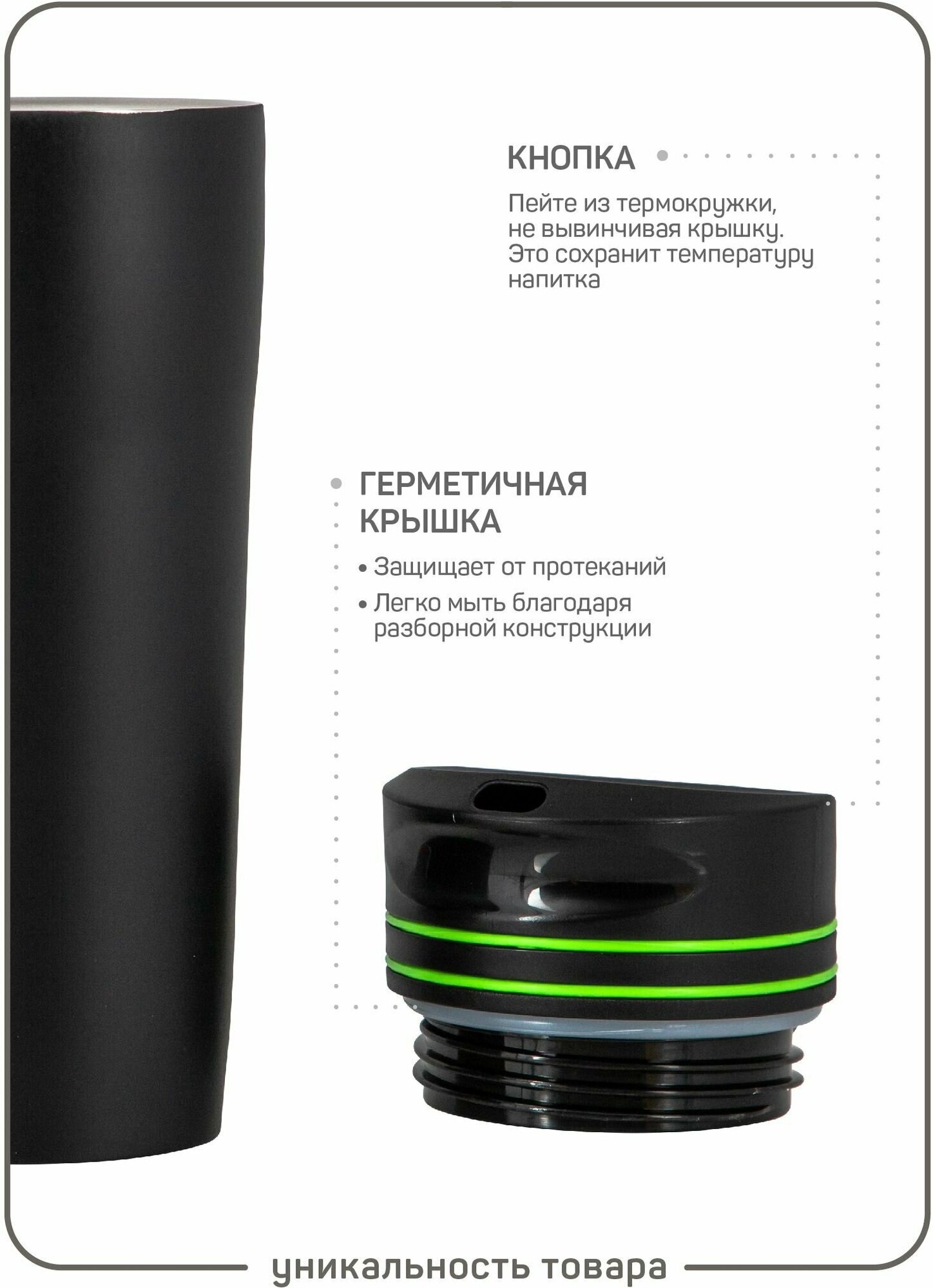 2. Дно из резины отвалилось через несколько месяцев - пришлось приклеивать 3. Неудобный носик для питья 4. Неудобная кнопка открывания 5. Внутренние части плохо продуманы в плане мытья после чая 6. Зелёные полоски - это просто резиночки, которые постоянно слетают |