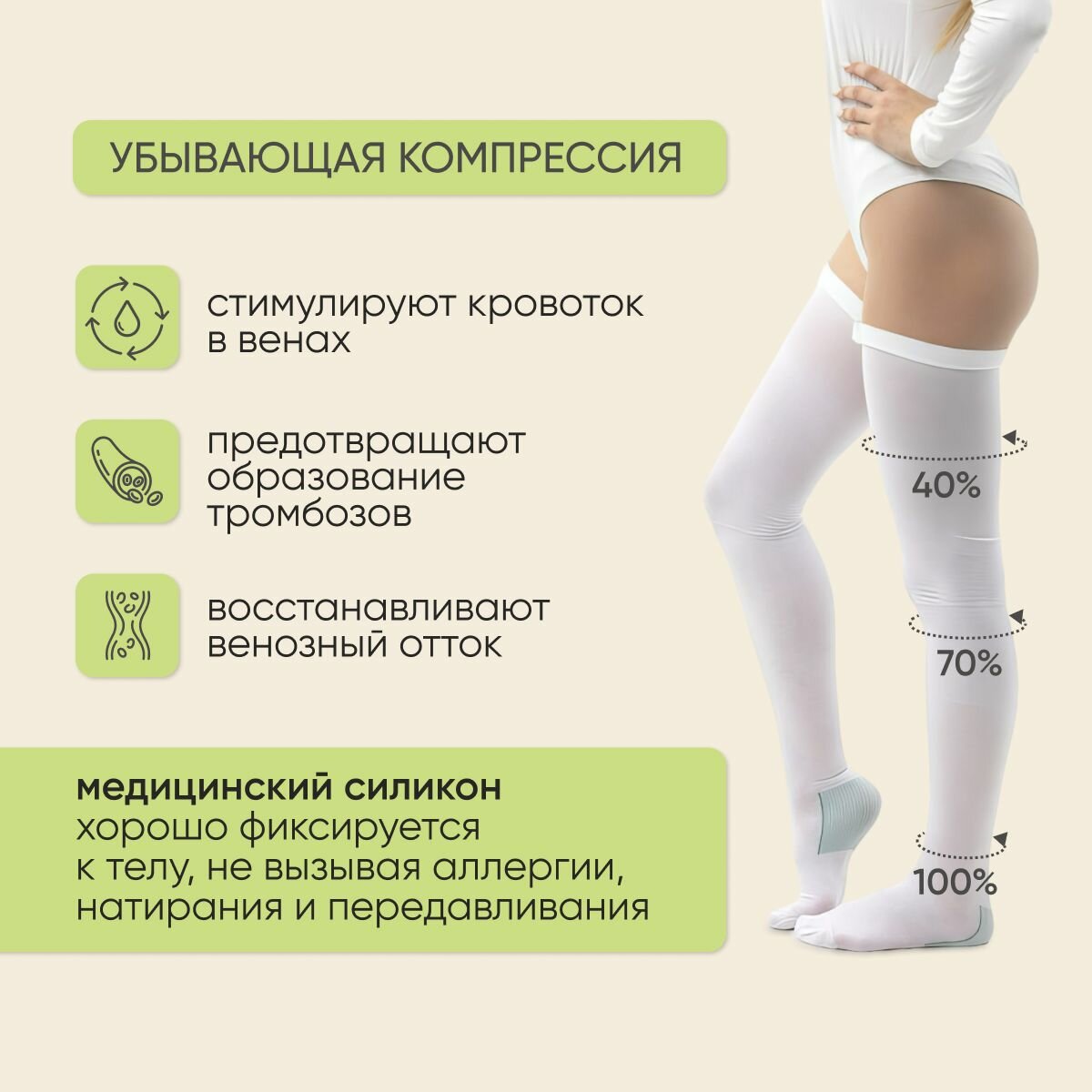 | Плюсы: | Компрессия хорошая, можно регулировать высоту по росту, Одеваются достаточно просто,Намного лучше. чем колготки, особенно летом.Цена тоже приемлимая. |