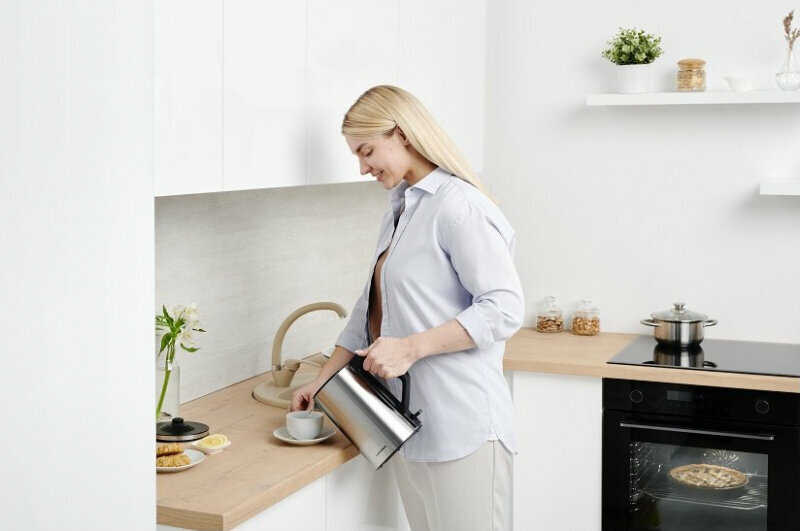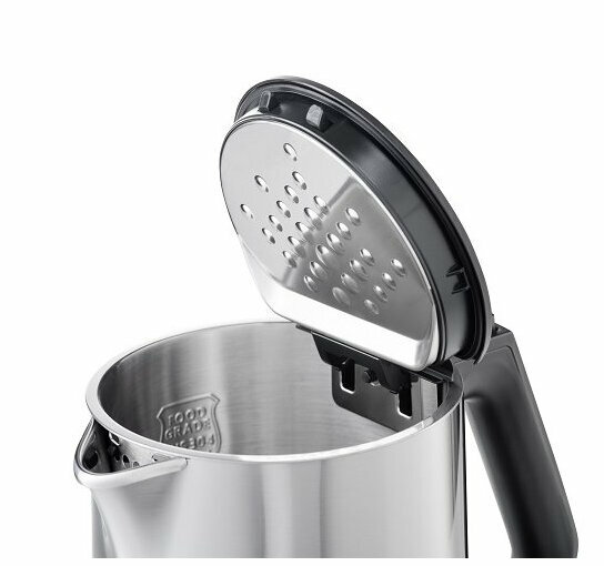 Цельнометаллическая колба внутри (долго прослужит), крышка внутри тоже металлическая (пластик с водой практически не контактирует). Тихий, быстрый, невысокий (хорошо входит под выведенный краник на раковине для очищенной воды). На наружных стенках ВООБЩЕ не остаются следы от пальцев, напрочь не липнут!!! Качественная сборка, никакого запаха от пластиковых деталей. Есть съемный фильтр от накипи. Двойные стенки - эффект термоса и внешняя слабо нагревается (безопасно). Вода их чайника льется ровно, без брызг. Устойчиво стоит на подставке. При снятии с базы выключается автоматически. |