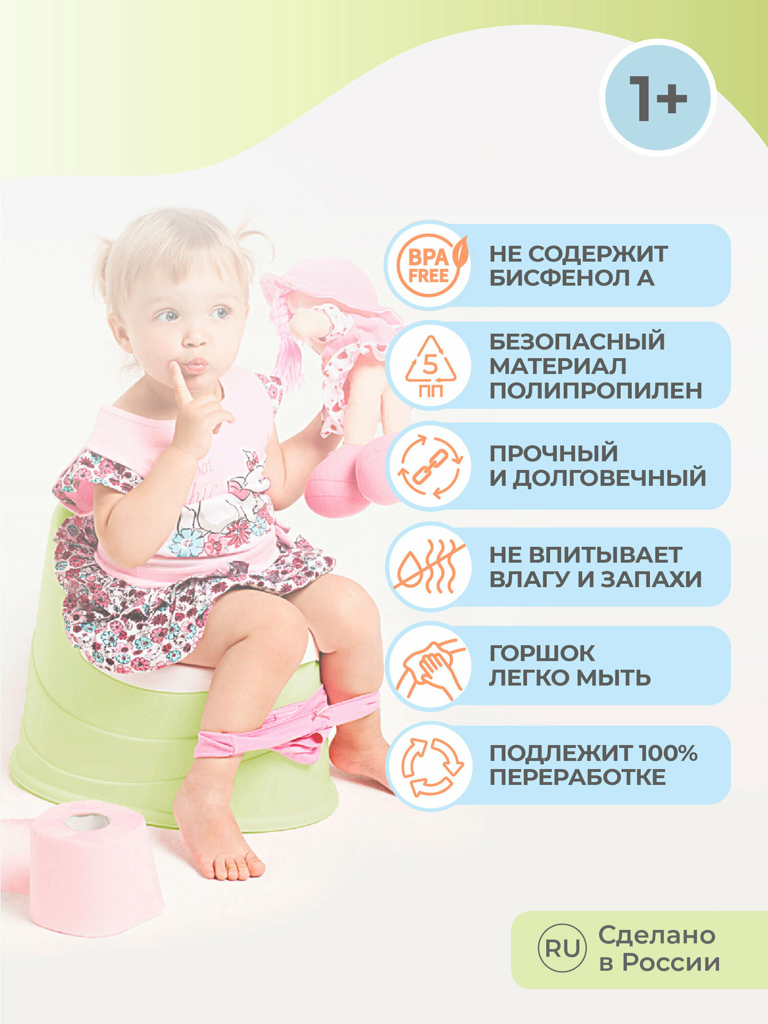 | Отзыв: | Это 2 горшок в нашей семье, первым пользуется старшая дочь (4года), очень удобный, пластик без запаха, приятный на ощупь. Единственное - это цвет отличается от картинки, он светлобежевый, но это погрешность фото, страшного ничего нет. |