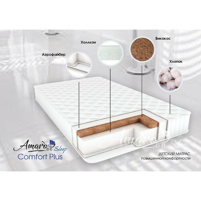 Матрас Amaro Baby со съемным чехлом, Comfort Plus 1190 x 590 х 120 (10мм - бикокос, 110 мм - холлокон, аэрофайбер, хлопок)