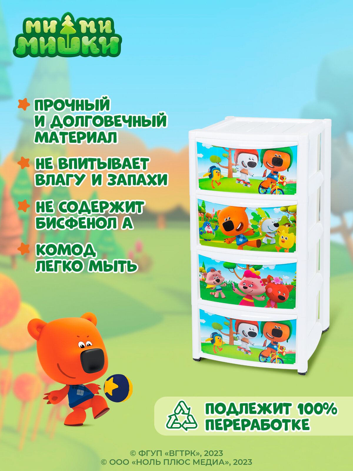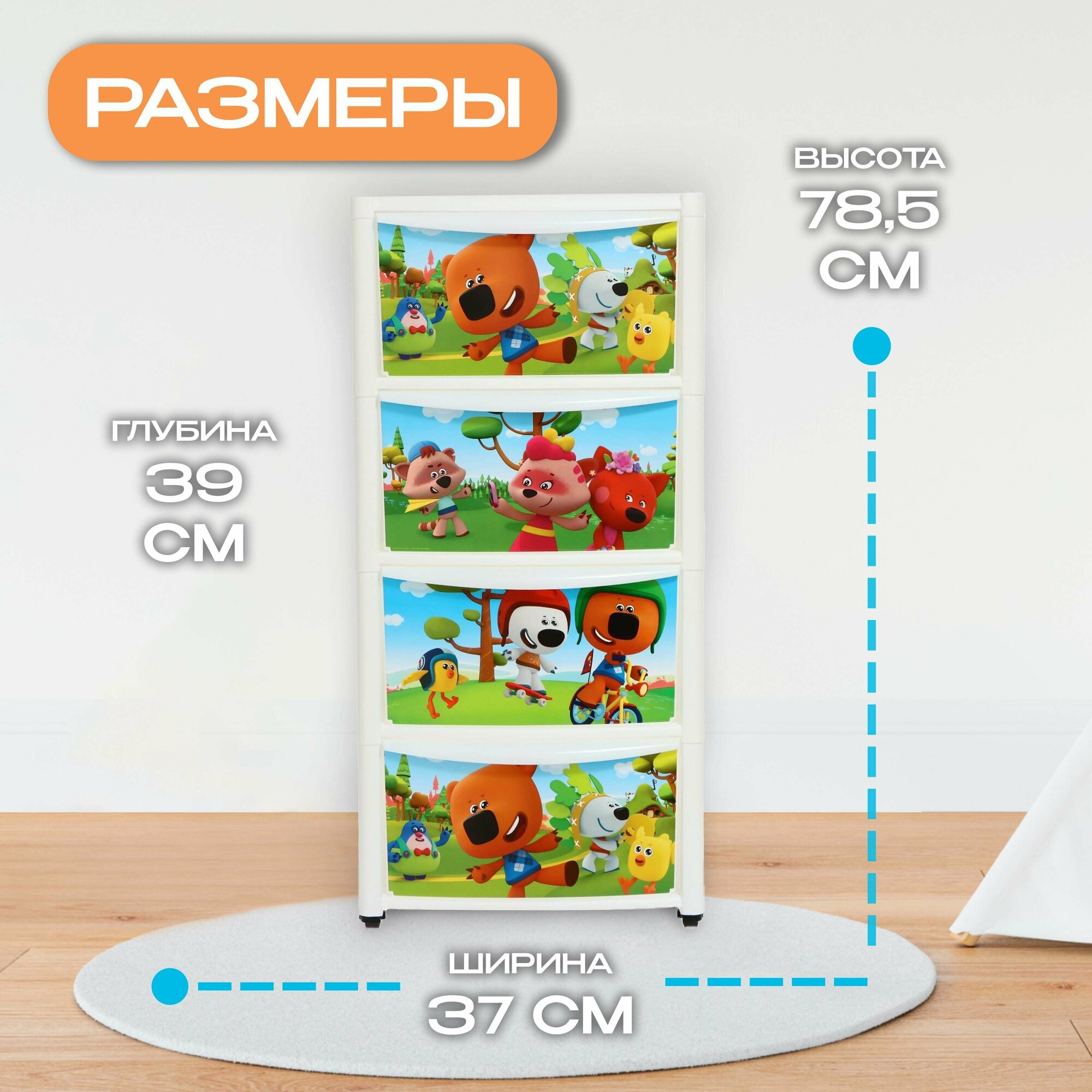 Комод детский четырехсекционный на колесах Пластишка, 390 x 370 x 785 мм, бежевый с аппликацией
