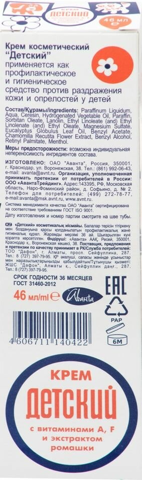 Крем детский (Аванта) с витаминами A, F и экстрактом ромашки, 46 мл
