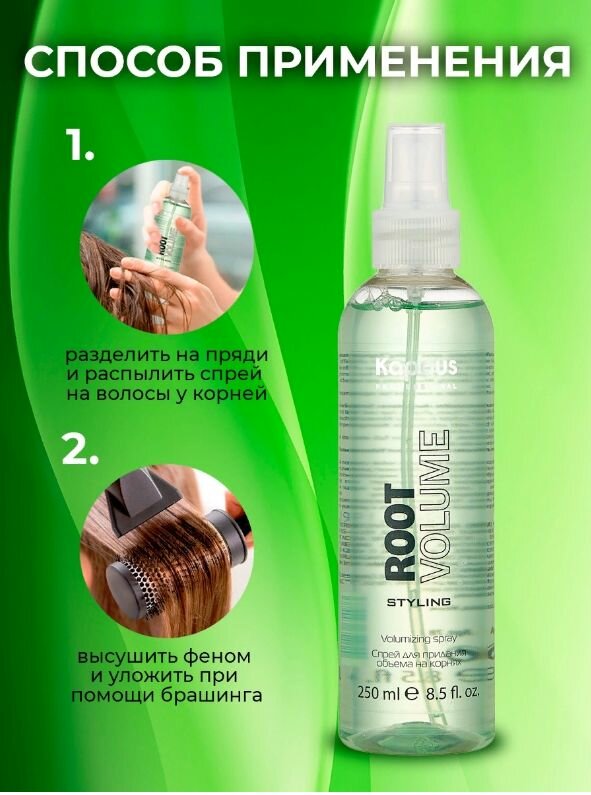 | Способ применения | Перед применением встряхнуть. Подсушенные полотенцем волосы, разделить на пряди и распылить спрей на волосы у корней, высушить обычным способом, для максимального объема - высушить феном и уложить при помощи брашинга. |