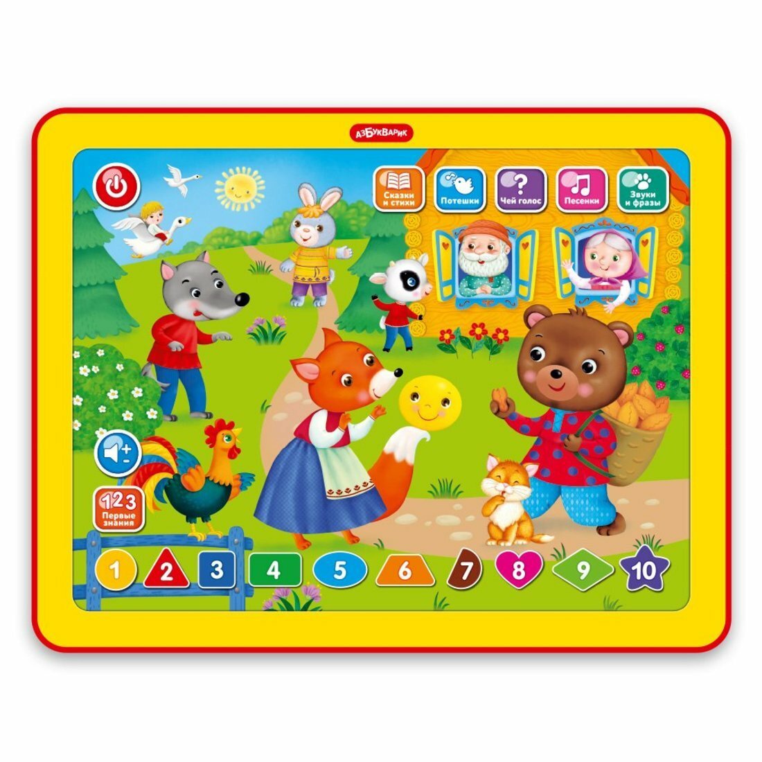 Азбукварик Планшетик "Колобок" (12 говорящих персонажей, 5 сказок, 7 стихотворений, 25 веселых звуков и голосов, 17 песенок, игра, первые знания)
