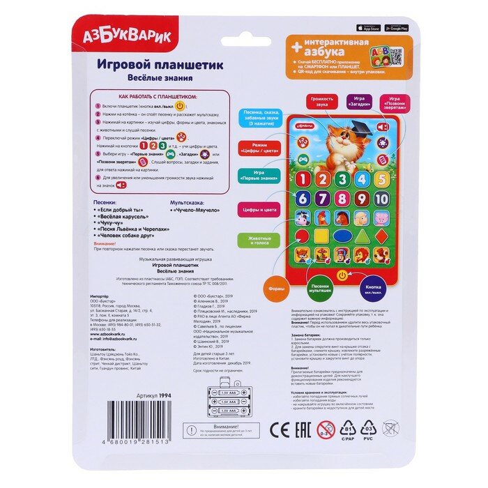 Азбукварик, Игровой планшетик - Планшетик Весёлые знания,1994
