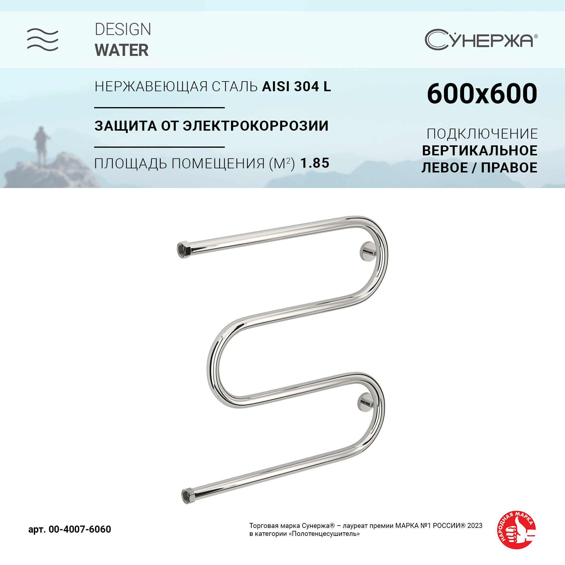 СУНЕРЖА М-образный Полотенцесушитель 600х600 нерж. сталь, нак. гайка 1" 00-0007-6060