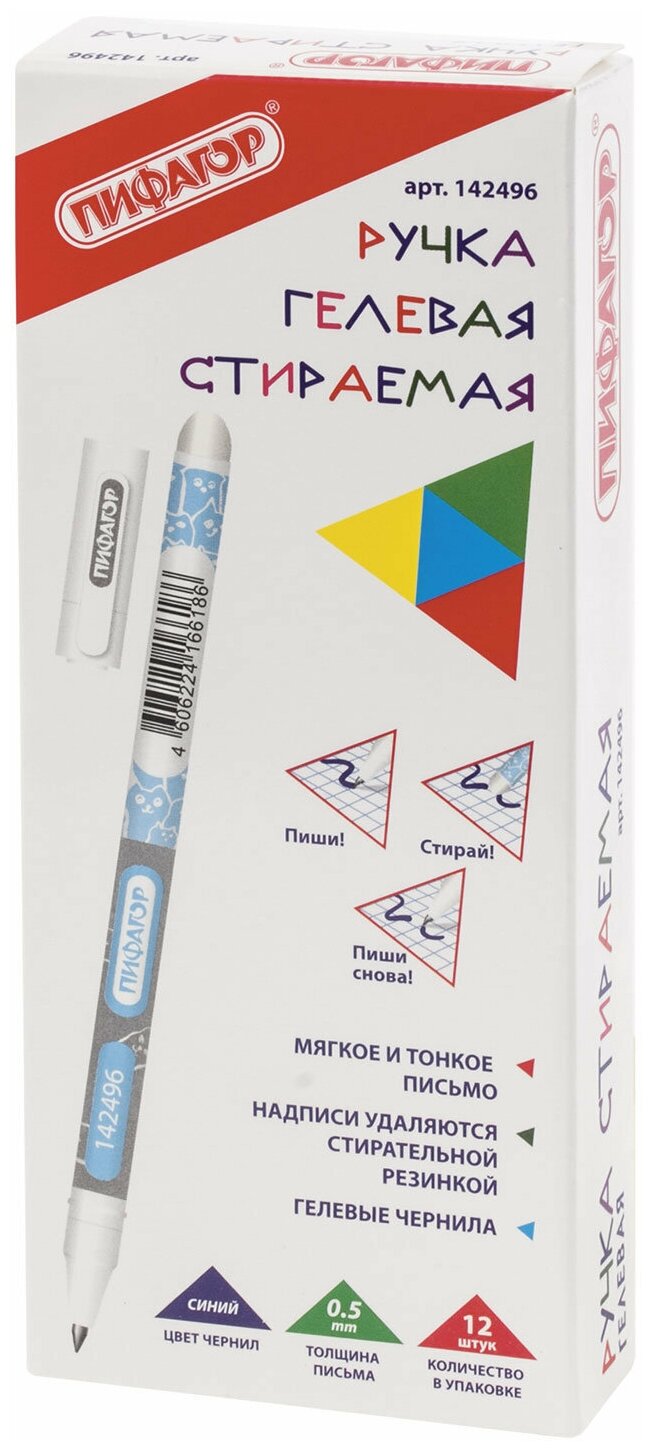 Ручка стираемая гелевая пифагор, синяя, корпус двухцветный, узел 0,5 мм, линия письма 0,35 мм, 142496 Комплект : 3 шт . интересное:
