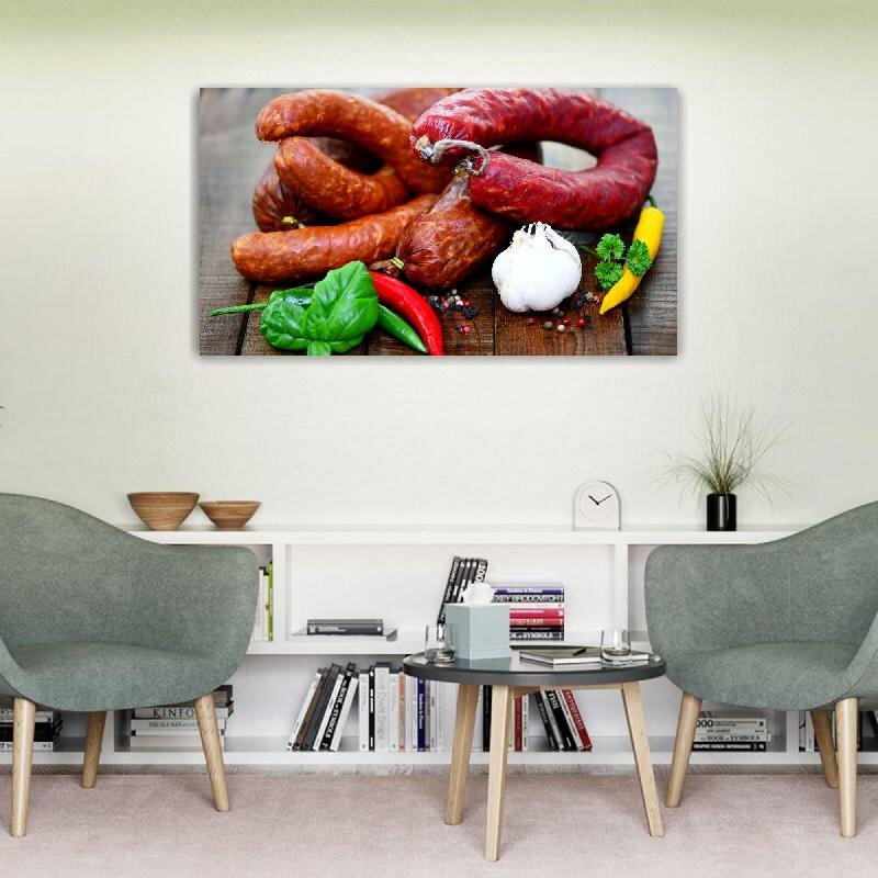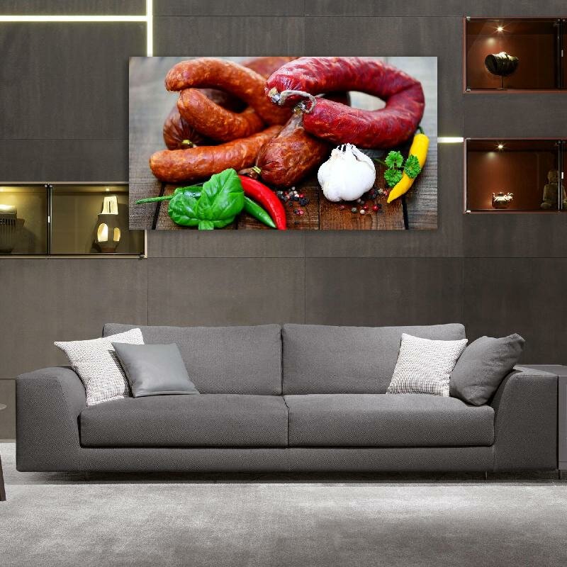 Картина на холсте 60x110 LinxOne "Колбаса чеснок овощи мясо" интерьерная для дома / на стену / на кухню / с подрамником интересное: