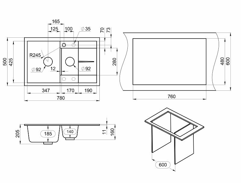 Кухонная мойка кварцевая Granula GR-7802 двухчашевая с крылом, врезная, чаша 350x425, 170x280, цвет базальт (7802bt)