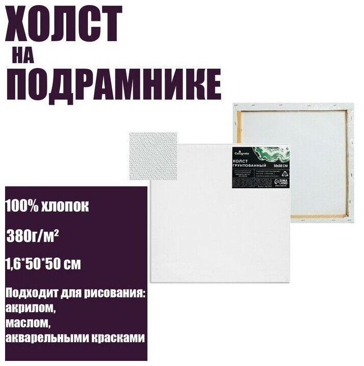 Холст на подрамнике, хлопок 100%, 1,6 х 50 х 50 см, акриловый грунт, среднезернистый, 380 г/м² интересное: