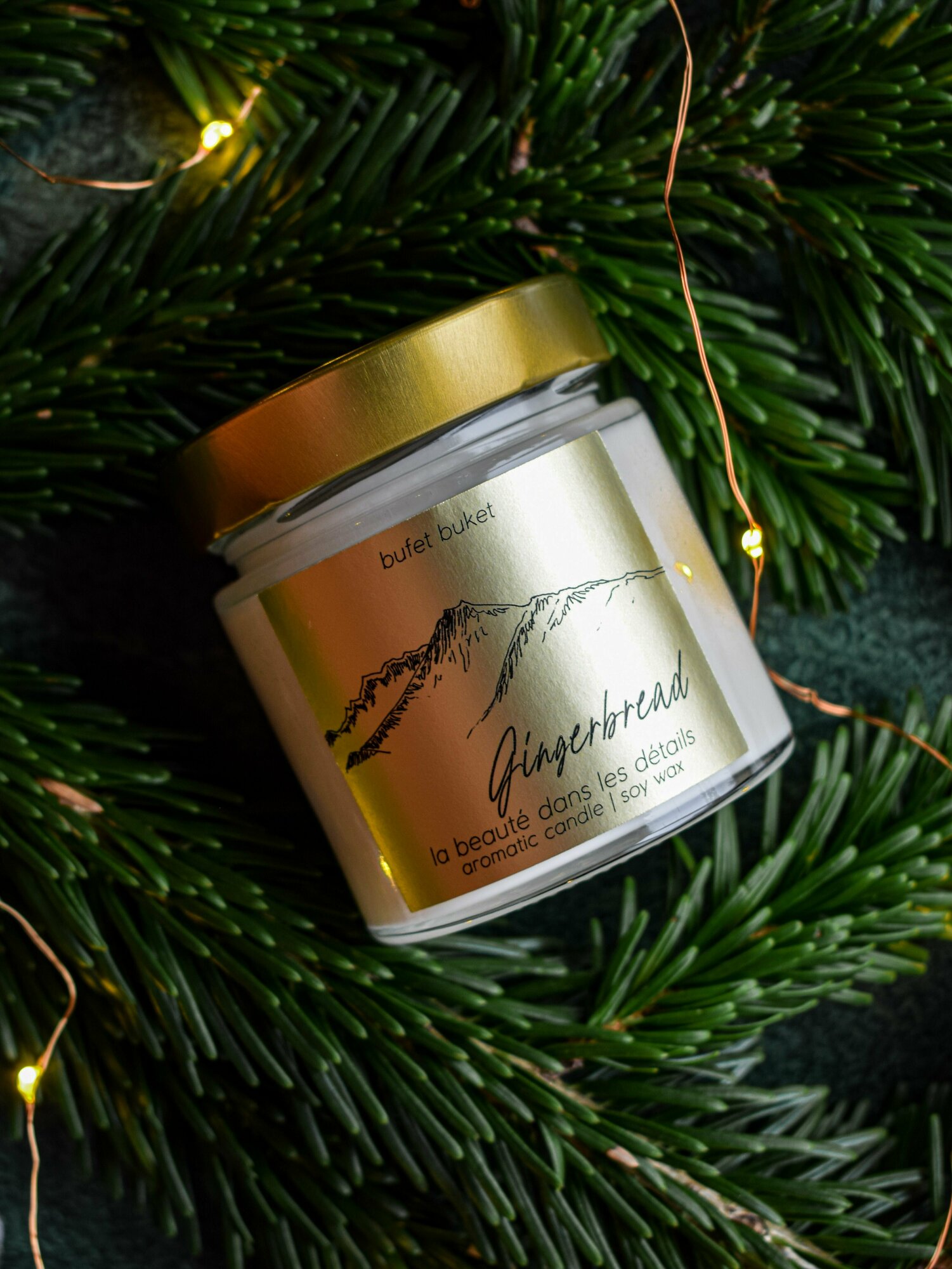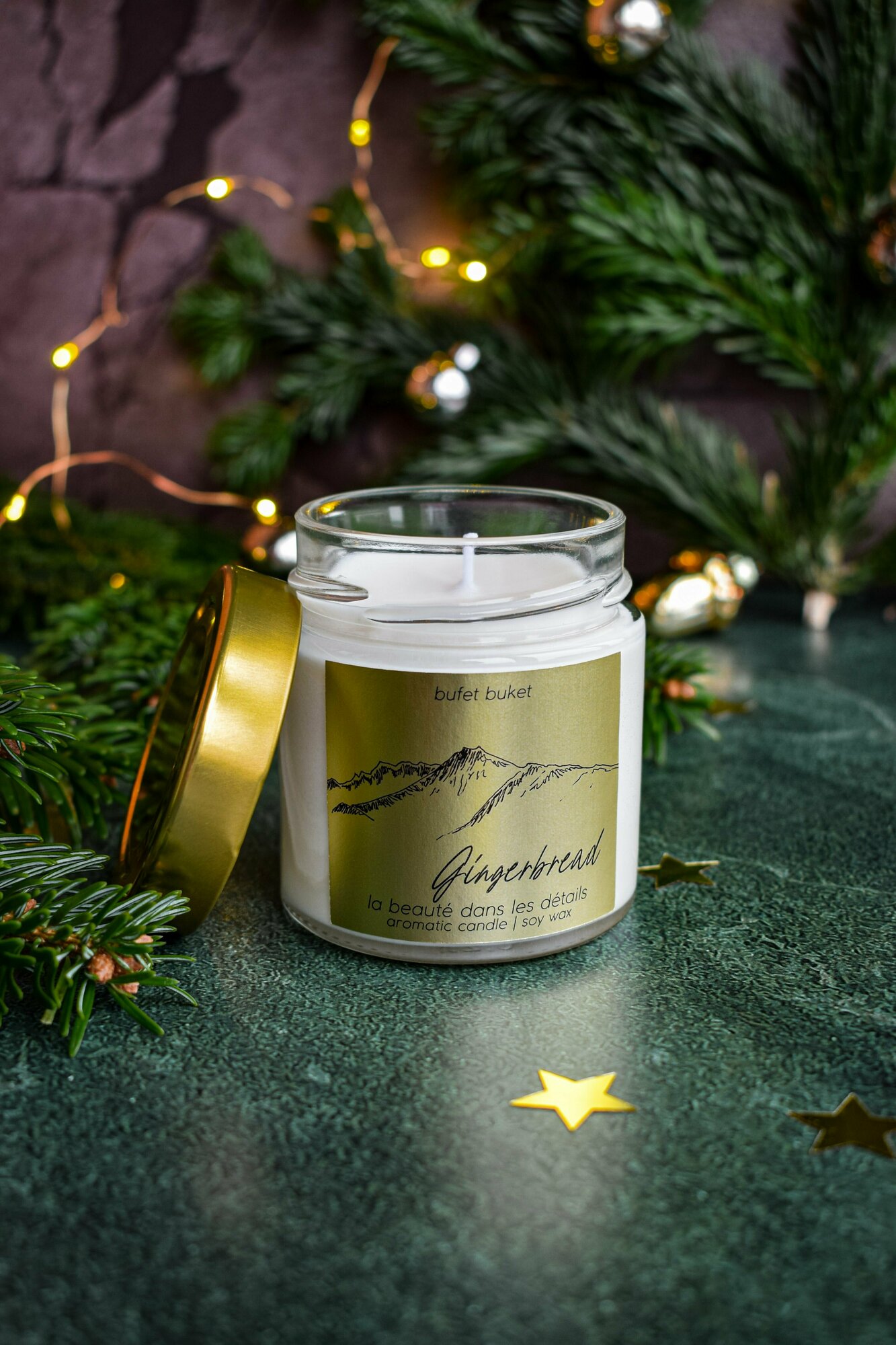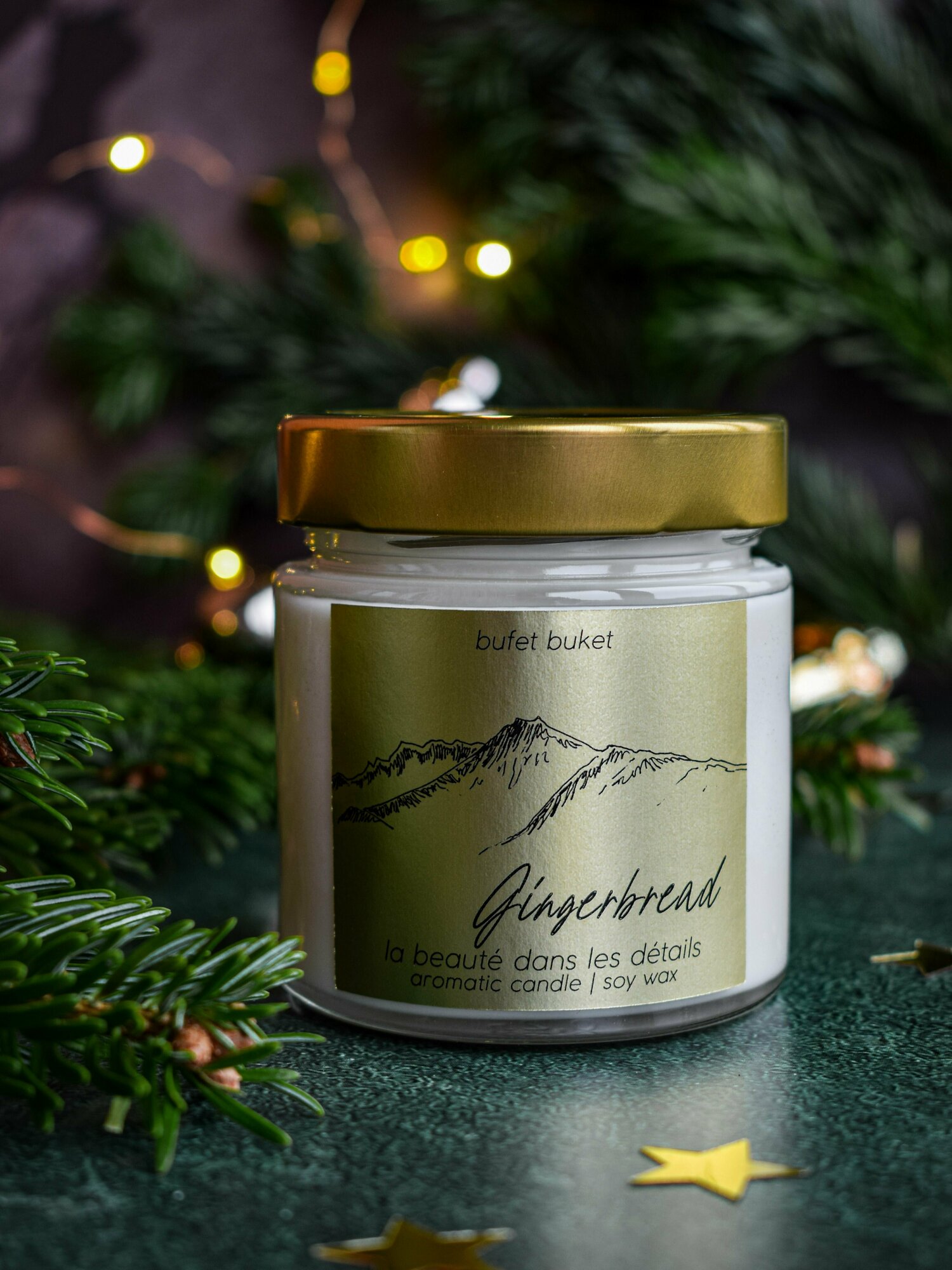 Купить Свеча ароматическая BufetBuket "Gingerbread / Имбирный Пряник" с рисунком "Горы" / Золотая / Новогодняя / 200мл, 8см x 7см, 1шт