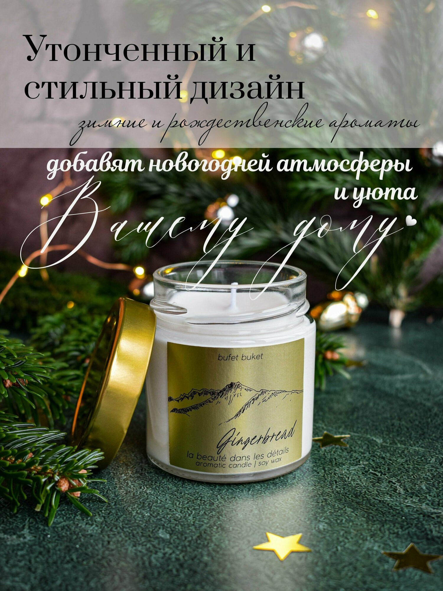 Свеча ароматическая BufetBuket "Gingerbread / Имбирный Пряник" с рисунком "Горы" / Золотая / Новогодняя / 200мл, 8см x 7см, 1шт интересное: