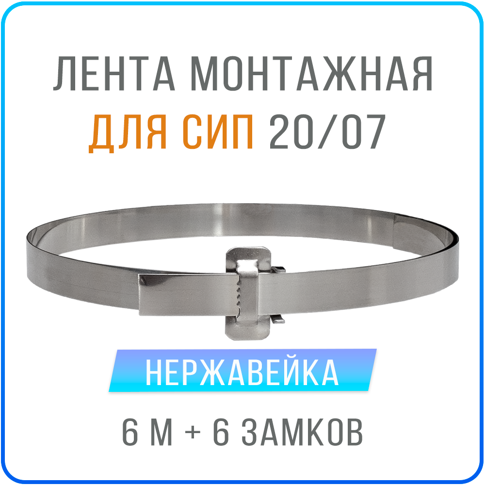 Купить Лента монтажная стальная 20 x 07 мм х 6 м + замки усиленные бугель BIB20 6 шт , бандажный хомут для столбов, крепления кронштейнов СИП, нержавейка 201