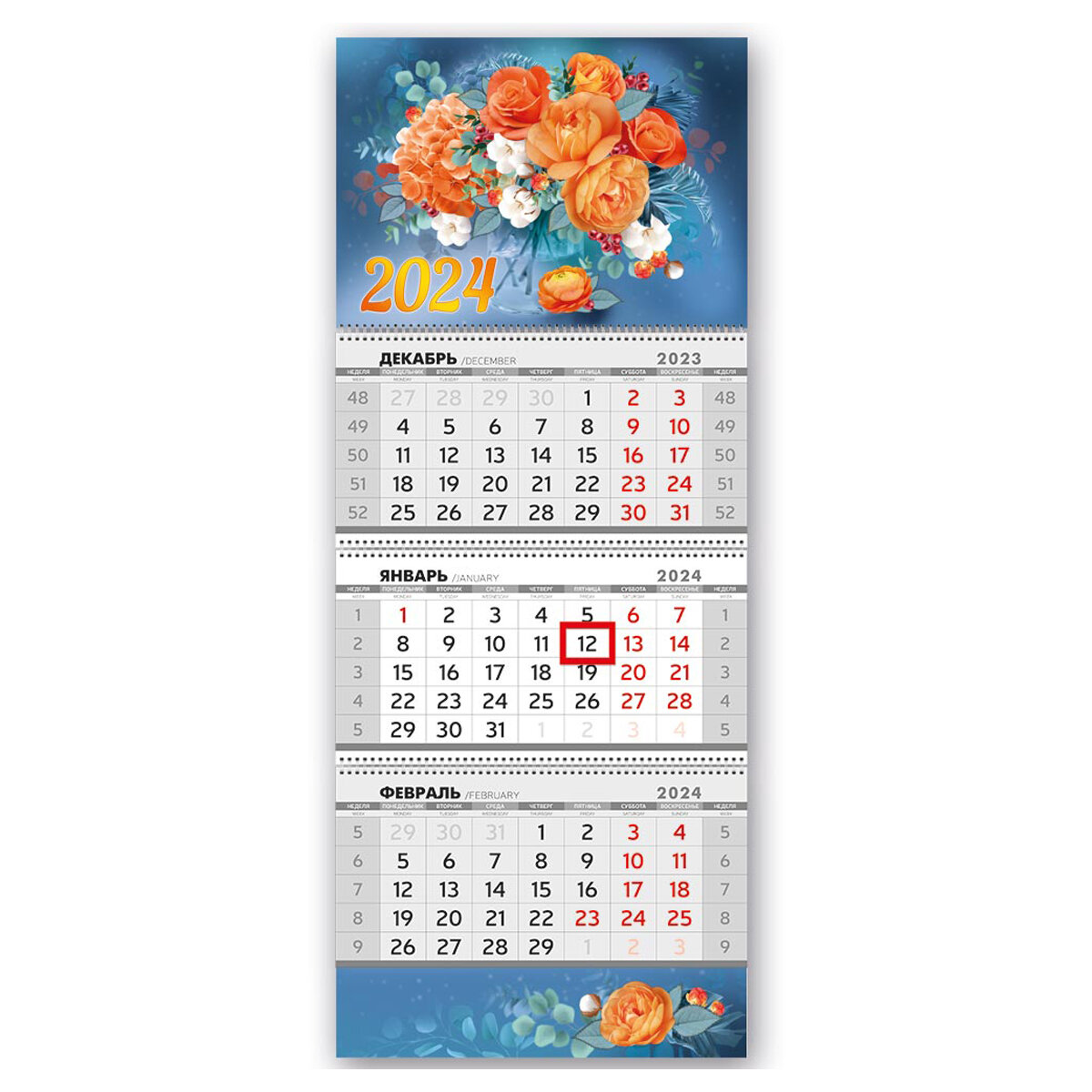 Комплект 12 шт, Календарь квартальный 3 бл. на 3 гр. Горчаков ГК "Яркие цветы", с бегунком, 2024г