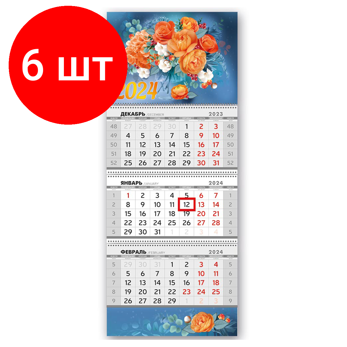 Купить Комплект 6 шт, Календарь квартальный 3 бл. на 3 гр. Горчаков ГК "Яркие цветы", с бегунком, 2024г