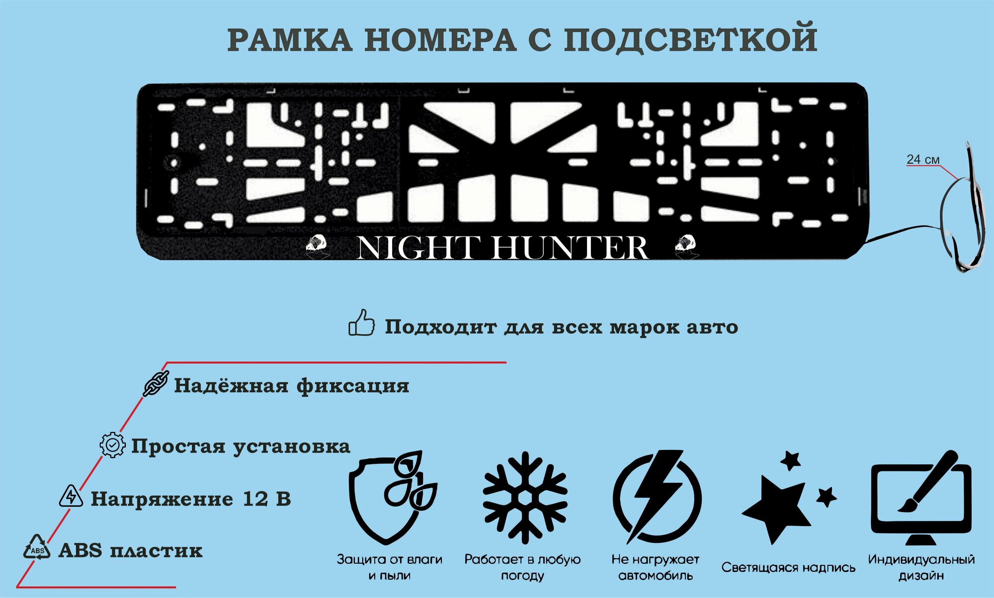 Рамка номера со светодиодной LED подсветкой с логотипом для автомобиля,night hunter,тюнинг авто,рамка гос номер, 1 шт, 12 В интересное:
