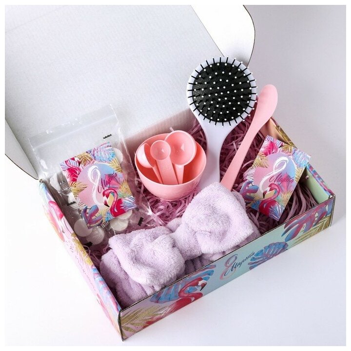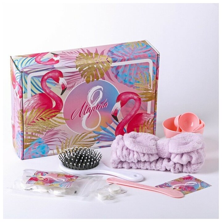 Купить Набор «С 8 марта»: расческа, повязка на голову, мерные ложки 3 шт, чаша и лопатка для маски, спрессованные маски