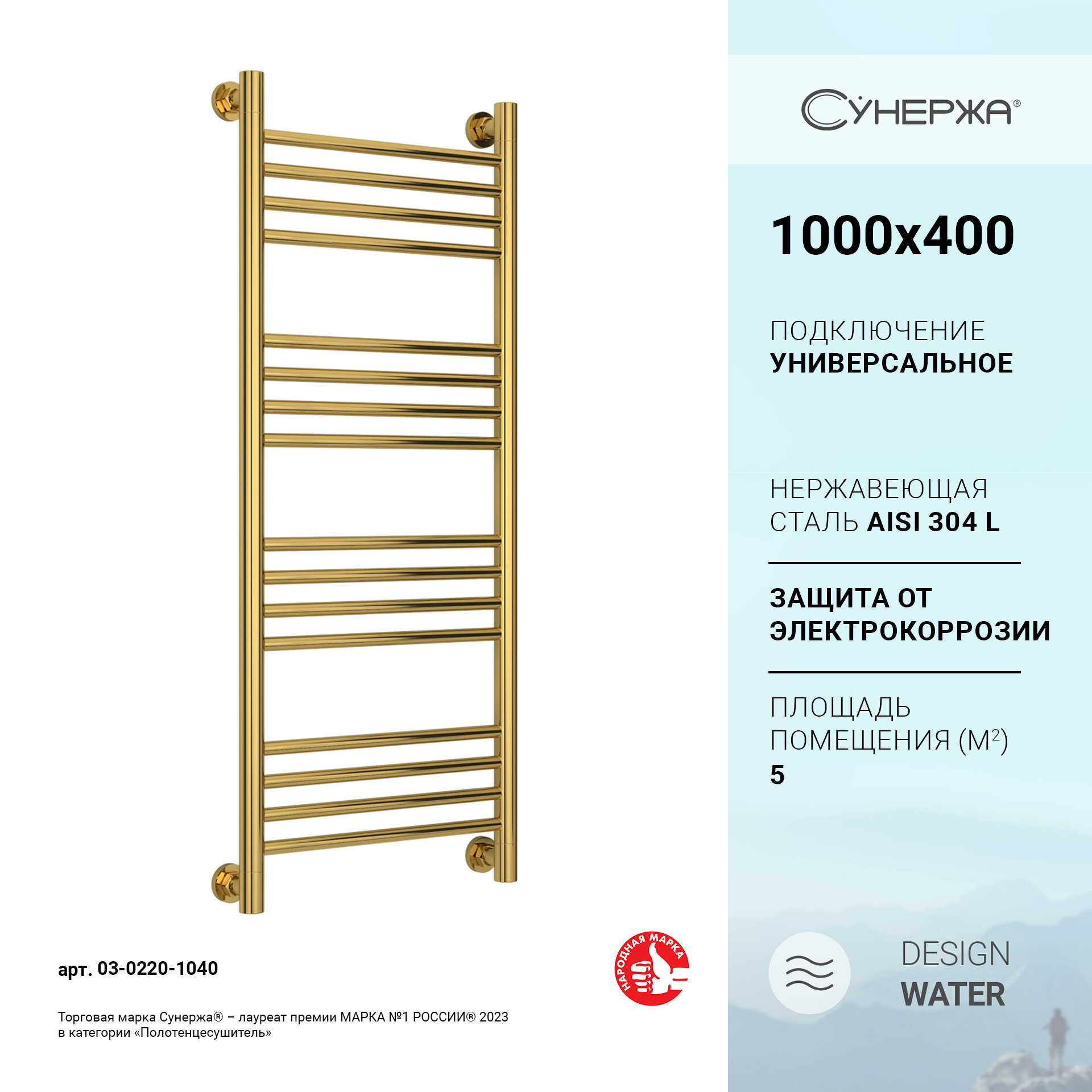 СУНЕРЖА Богема+ прямая Полотенцесушитель 1000х400 (16 ступ.) золото,унив.под. 3/4" 03-0220-1040